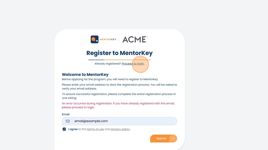 If you receive this error, this means that you have already registered to MentorKey. To proceed with filling out the application form, please click on "Proceed to login" and follow these instructions.